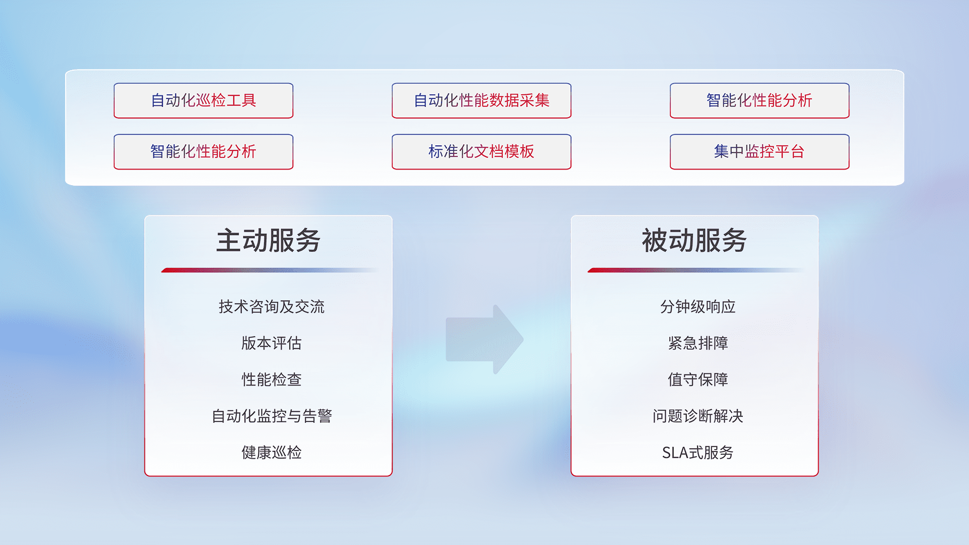 智能化工具和标准化文档,,,,保障服务质量,,提供主动服务(包含技术咨询、、、、版本评估、、、、性能检查、、自动化监控与告警、、健康巡检)和被动服务包含(分钟级响应、、紧急排障、、值守保障、、、问题诊断解决、、、、SLA服务)。。